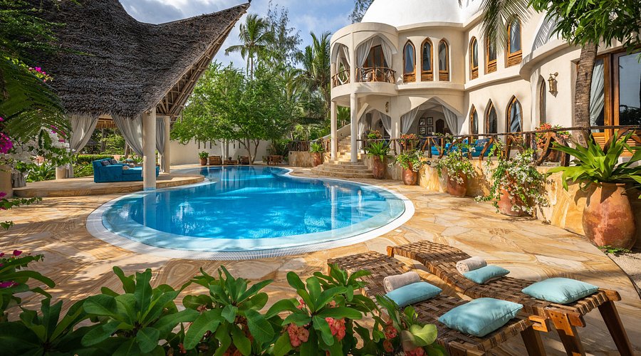 Luxury villas, beach resorts, and safari lodges including Xanadu Luxury Villas & Retreat, Hotel Riu Palace Zanzibar, Gibbs Farm, and Elewana Tarangire Treetops.